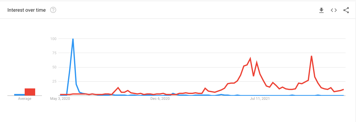The other important thing to know is that CRT was a non-entity on the right until the George Floyd uprisings in June 2020. Three months later, in early September, Rufo went on Tucker Carlson to espouse the evils of CRT. You can see in the Google Trends graph below that the early peak was then superseded by a spike in June 2021, when Florida and other states began drafting and implementing laws that ban teaching CRT in schools, and again in the run-up to the Virginia gubernatorial election, where Republican candidate Glenn Youngkin made CRT a central issue. It’s also worth noting that Youngkin’s first act as governor was to sign an executive order banning the teaching of CRT that specifically references the “ills of communism.” (Blue line is searches for George Floyd protests, red is CRT)